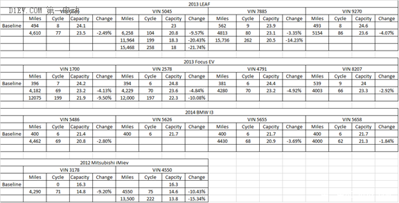 圖6主要是對2013 LEAF、2013 Ford Fucus和2014 BMW I3還有2012 的三菱iMiev進行記錄和測試。由于這幾個車里程都比較接近,所以得到的數據有些一致。