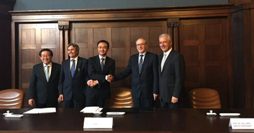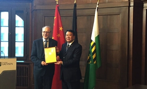 圖為德國薩克森州州政府議政廳簽約儀式現場,從左至右依次為:科技部部長萬鋼、德累斯頓工業大學校長漢斯、北汽新能源總經理鄭剛、德累斯頓工業大學院士胡芬巴赫、薩克森州州長蒂利克。
