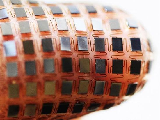今天,在美國國家科學院院刊發布的新研究里,Rogers描述了他們設計最近的樣子:把用可伸展的太陽能電池電路連接起來的許多纖薄的、毫米級的固態鋰離子電池構成的陣列放置在柔性基底上,然后折疊起來,這樣在最終的設備中太陽能電池板就能保證堆疊在電池之上。他用來演示這項新技術的設備是一個由熱敏元件和NFC無線模塊組成的可以測量和記錄溫度并且在必要時能將得到的數據傳送出去的設備,而電池組是它的一部分。Rogers的團隊測試的志愿者在騎行和洗澡的時候測試了這個設備。這個纖薄柔韌的電池可以在不影響太陽能發電性能的情況下伸展30%之多,Rogers表示這意味著用戶在使用的時候會幾乎感覺不到它的存在。
