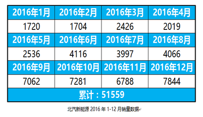 2016年,新能源汽車領域又完成了進一步的跨越,以全年超40%的增長速度,為大家展現了何為“朝陽行業”,而其中翹楚當屬北汽新能源。據乘聯會的銷量統計數據,北汽新能源12月份銷量數據7,844輛,完美收官。這樣,2016年北汽新能源整車銷售51,559輛,同比增長156%,連續四年蟬聯國內純電動汽車市場銷量冠軍,再次鞏固行業領軍者地位。
