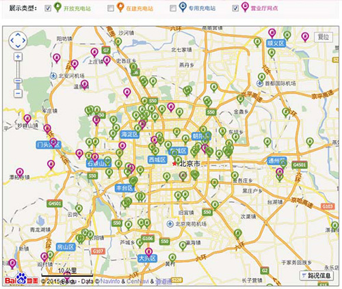 圖為北京已開放充電站地圖(數據來源于北京電動汽車智能服務平臺)