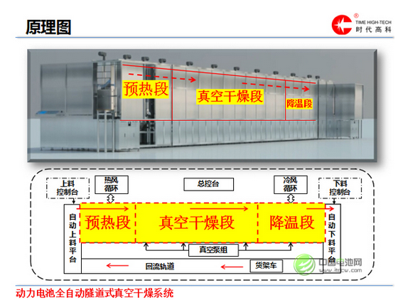 據(jù)吳和瑋介紹,這是時代高科隧道式真空干燥系統(tǒng)的一個示意圖,可以看到最右邊有兩個貨架車,時代高科物料裝在貨架車上,由最右邊的入口進入隧道,向前移動,分別通過了預熱段,真空干燥段,冷卻段,最后從隧道的出口。其實這個出口是直接進入下一道工序的。出來以后物料就已經(jīng)完成了干燥,卸載以后,空載的物料車,通過時代高科的中轉(zhuǎn),然后回流,回到最前端,完成下一段的一個循環(huán)。在此過程當中可以看到,不需要干燥房,無需人工操作,隧道中工作環(huán)境24小時永遠是恒定的,從而實現(xiàn)了自動化、一致性還有低功耗。