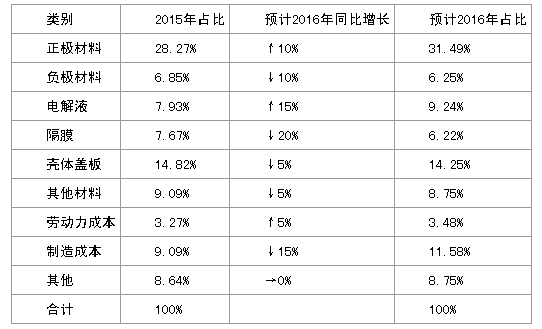 其他部分主要指資金使用成本和環保成本。目前電池企業大都在擴產,而企業的盈利能力根本不足以支撐這種擴張,因此,資金的使用成本很難下降,同時,在環境壓力越來越大的現實狀況下,環保成本毋庸置疑也不可能下降。這些成本2016年不上升就不錯。墨柯這里預計保持2015年的水平。