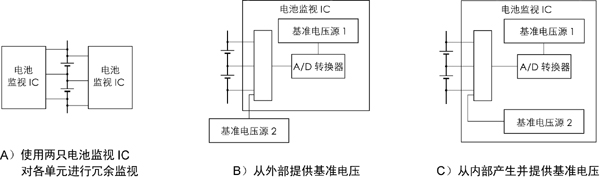 其中,A)電路為使用兩組IC對(duì)同一組電池組進(jìn)行冗余監(jiān)視;B)為從外部提供一個(gè)標(biāo)準(zhǔn)電壓源2用于確認(rèn)IC的測(cè)定精度。C)為從內(nèi)部產(chǎn)生該標(biāo)準(zhǔn)電壓源。