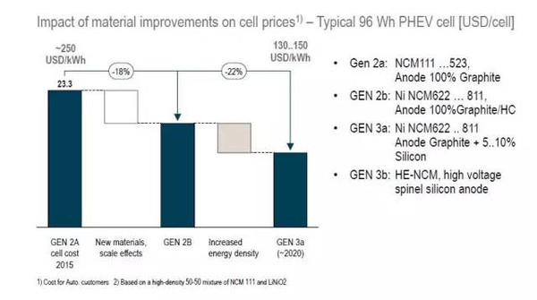 作為電動汽車的核心成本的電池,其價格也將經(jīng)歷急劇的下降趨勢。由于越來越大的規(guī)模化及核心技術(shù)的突破,2015年,平均成本約250美元/kWh的電動汽車電池,到2020年時,將下降到130-150美元/kWh,降幅將達40%。