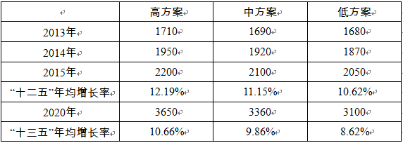 推薦采用中方案,到2015年全社會用電量達到2100億kWh,到2020年會社會用電量將達到3360億kWh。