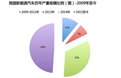 與此同時,從2009年至今,我國新能源汽車尤其進入2014年后,開始集中爆發,其中,2014年和2015年至今的產量規模,甚至占據了2009至今所有產量規模的80%以上。