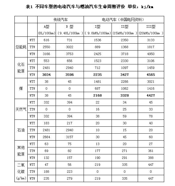 在我國2012年發電裝機和能源結構情景下,選取三種不同耗電特性的電動汽車計算燃料生命周期評價結果,分別是9.8kWh/100km (I 型)、15kWh/100km (II 型)、20kWh/100km (III型)和兩種不同油粍特性的燃油汽車,8L/100km (A型)(中國新發布的新生產汽車油耗標準)和9.48L/100km (B型)。參考實際車輛的情況,認為在汽車的驅動力和舒適性等性能比較上,III型電動汽車與B型燃油汽車相近,II型電動汽車與A型燃油汽車相近,I型電動汽車與1.0L排量以下的小型燃油汽車相近。查閱中國電網研究院資料,采用不同能源發電方式時的能耗和二氧化碳排放對比表如下: