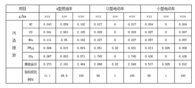 是否所有電動汽車都比燃油車更環保?汽車的生命周期評估中引入了汽車尾氣中的非甲烷烴(NMHC)、氮氧化物(NOx)、懸浮顆粒物(PM)、硫氧化物(SOx)等排放量的計算。為了便于比較,增加小型電動車的廢氣排放分析,取樣為整備質量為400 kg的小型電動汽車,經濟性指標目標值為5kWh/100 km。根據電力行業火電廠平均供電標準煤耗及SOx排放等指標,基本結果分析如下: