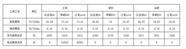 注:上海市充電電價為0.617元/kWh,深圳市充電電價為0.68元/kWh,合肥市充電電價為0.5953元/kWh。上海市消費者日均行駛里程為40km,年均行駛14400km (假設每年行駛360天);深圳市消費者日均行駛里程為35km,年均行駛12600km;合肥市消費者日均行駛里程為25km,年均行駛9000km。在車輛維護費用方面,主要包括車輛維護保養費、車輛維修費、保險費、養路費等,純電動汽車年檢保養費用約為每l00km/6.16元,普通車輛為每l00km/14元;在電池更換成本方面,本文取電池循環充電次數為2000次。