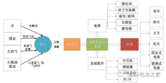 在氫燃料電池產業鏈中,上游是氫氣的制取、運輸和儲藏,在加氫站對氫燃料電池系統進行氫氣的加注;中游是電堆等關鍵零部件的生產,將電堆和配件兩大部分進行集成,形成氫燃料電池系統;在下游應用層面,主要有交通運輸、便攜式電源和固定式電源三個方向。