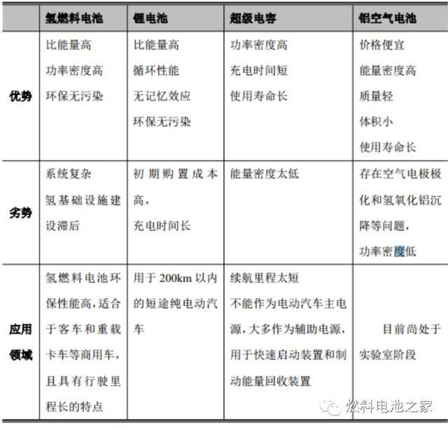 目前在交通運輸用動力源方面,主要有四種技術路線:鋰離子電池、氫燃料電池、超級電容和鋁空氣電池。其中鋰離子電池、超級電容和氫燃料電池得到廣泛的應用,而鋁空氣電池尚處于實驗室研究階段。能源補給方面,鋰離子電池、超級電容適用于純電動汽車,但是需要外部充電,而氫燃料電池汽車則需要外部氫氣加注,鋁空氣電池則需要補充鋁板和電解液。