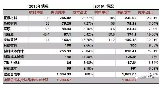 電池廠的電芯制造成本。注:①正負極材料和電解液單價元/kg,隔膜元/㎡,殼體蓋板元/套,電池芯理論成本元/kWh。②本表以25Ah的磷酸鐵鋰方形電池來計算,表中僅指A品,若含能夠賣出去的B品乃至C品,2015年底每Wh大概1.2元,2016年底大概在1.25元以上,三元電池因材料的漲價,成本會更高一些。③因時間關系,表中部分類別的成本為推估,不一定很準確,僅供參考。