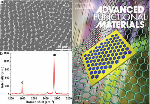 圖2 大面積自組裝的單晶石墨烯陣列(左)和《先進功能材料》封面(右)
