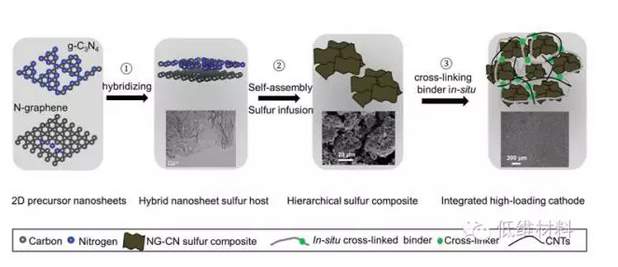 Figure 1. A schematicillustration of the concept of coupling hierarchical sulfur composite based ona hybrid host with in situ cross-linked binderin order to fabricate stablehigh-loading cathodes. Step 1 starts with hybridizing two individual 2Dnanosheets (graphene and g-C3N 4) to form thenanosheet-type host material; instep 2, hierarchical sulfur composites are formed as large multi-micrometersized secondary particles formed as aconsequence of evaporation inducedself-assembly and sulfur infusion; step 3 involves in situ cross-linking of thecarboxymethyl cellulose binder inthe presence of the sulfur composites.