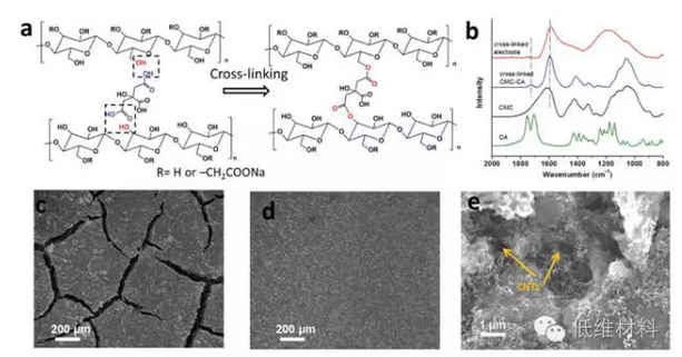 Figure 2. a) Aschematic illustration of the cross-linking of CMC binder with CA as thelinker, based on the esterifiation of the –OH groups in CMCand the –COOH groupsin CA at 150 °C. b) The FTIR spectra of the pristine CA, CMC, cross-linkedCMC-CA (without the sulfur composite) and thein situ cross-linked sulfurelectrodes. c–e) The SEM images of the surface of sulfur cathodes fabricatedusing (c) PVDF binder and (d,e) cross-linkedCMC-CA binder.