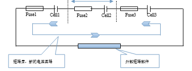 說明:以上的Fuse1是指Cell內(nèi)部的保險部件,在電芯短路時會斷開電芯與外界的連接。 Fuse1Cell1Fuse2Cell2Fuse3Cell3+_U反=UCell1+Ucell2+UcellX外部短路部件 短路后,新的電壓回路