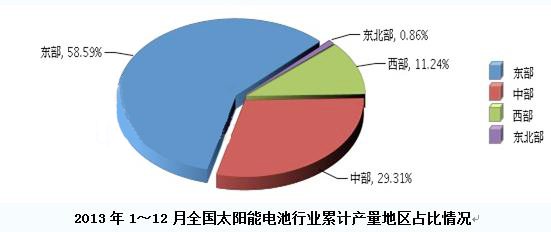 2013年1~12月全國(guó)太陽(yáng)能電池行業(yè)累計(jì)產(chǎn)量地區(qū)分布情況