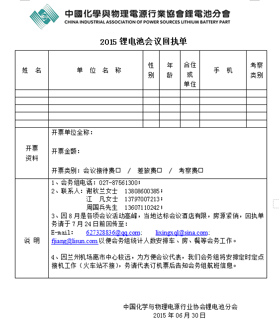 中國化學與物理電源行業協會鋰電池分會擬定于2015年08月18在蘭州市召開第三屆五次理事會議/暨鋰電池專題論壇。現就會議事項通知如下: