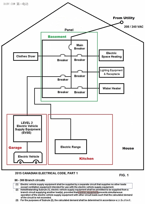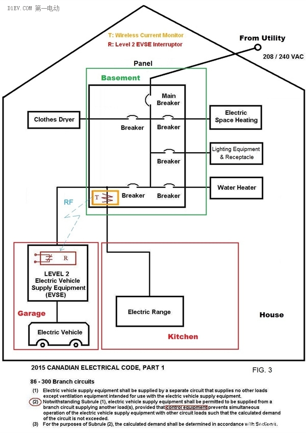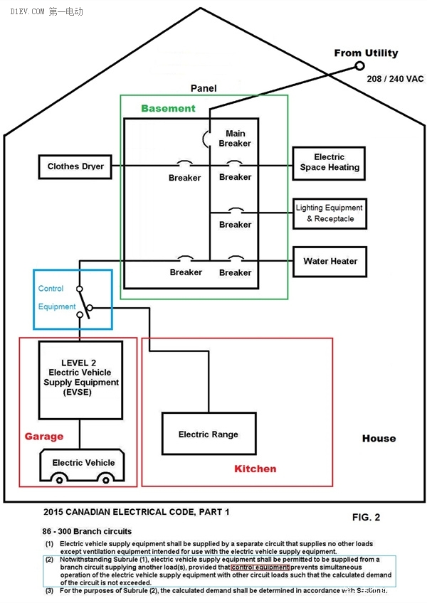 但是,為了適應(yīng)電動(dòng)車普及和發(fā)展的需求,“2015加拿大電氣安裝規(guī)范”已經(jīng)添加了條款(2),允許“家用交流充電樁”同其它家用電氣設(shè)備共用同一個(gè)回路,但條件是要有一個(gè)控制裝置 (Control Equipment) 保證這兩個(gè)在同一回路上的電氣設(shè)備不能夠在同一時(shí)間共同被使用:2015 CANADIAN ELECTRICAL CODE added 86-300 (2), "the EVSE shall be permitted to be supplied from a branch circuit supplying another load(s), provided that control equipmentprevents simultaneous operation of the EVSE with other circuit loads",如圖二所示。從圖中可以看出,無(wú)論該控制裝置是簡(jiǎn)單的手動(dòng)“轉(zhuǎn)換開關(guān)”,還是自動(dòng)的“互鎖交流接觸器”等,都需要電動(dòng)車車主除了購(gòu)買一臺(tái) “家用二級(jí)交流充電樁”外,還要付出額外的購(gòu)買和安裝費(fèi)用。