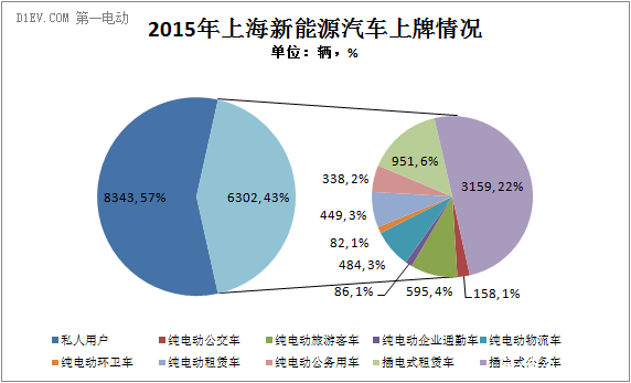 據了解,2015年12月上海上牌運行的14715輛新能源汽車中,插電式混合動力11381輛,純電動3334輛。私人用戶購買8343輛,法人用戶購買6372輛。法人用戶中包括純電動公交車158輛,純電動旅游客車595輛,純電動企業通勤車86輛,純電動物流車484輛,純電動環衛車82輛,純電動租賃車449輛,純電動公務用車388輛,插電式租賃車951輛,插電式公務用車3159輛。
