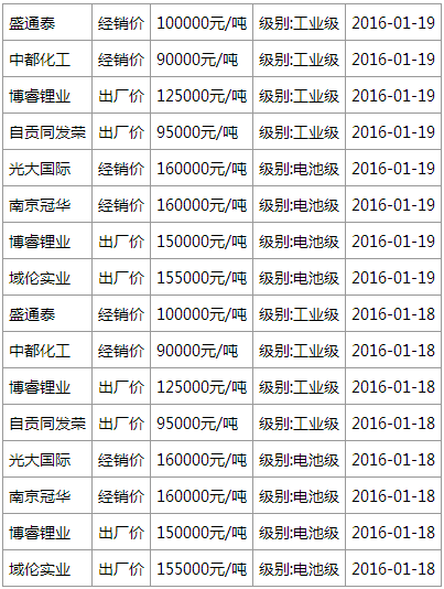 1月18日,四川興晟鋰材料有限公司和四川國(guó)理鋰材料有限公司報(bào)價(jià)上調(diào),工業(yè)級(jí)氫氧化鋰160000元/噸,電池級(jí)氫氧化鋰180000元/噸,工業(yè)級(jí)碳酸鋰180000元/噸,電池級(jí)碳酸鋰200000元/噸,每噸較前期漲幅達(dá)5萬元,市場(chǎng)貨源緊張,業(yè)內(nèi)人士神經(jīng)再次彈跳。據(jù)之前數(shù)據(jù)統(tǒng)計(jì)顯示,碳酸鋰市場(chǎng)價(jià)格已從去年9月份的5萬元/噸漲到了12萬元/噸,2016年4、5月份的期貨價(jià)格已報(bào)出15萬元/噸。雖然價(jià)格瘋漲,但現(xiàn)貨市場(chǎng)供應(yīng)依然緊張。