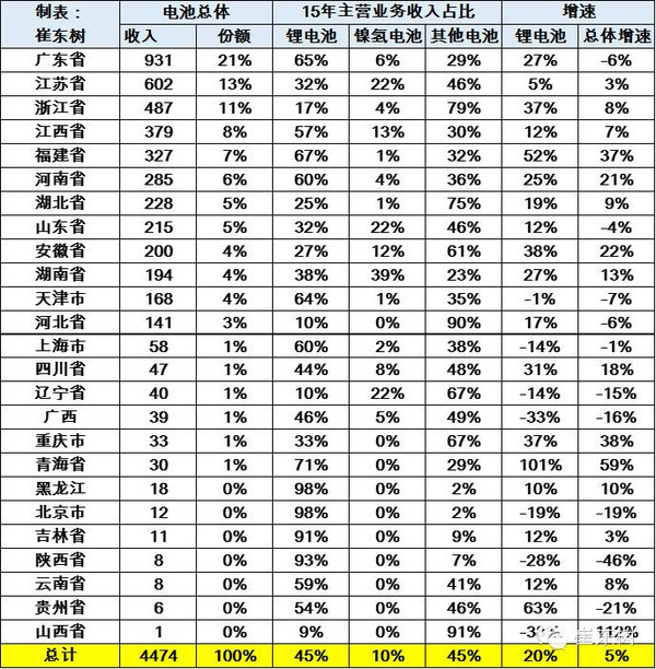鋰電池企業的產業鏈相對集中,電池產量主要集中在廣東、江蘇、浙江、江西、福建、天津、浙江、湖北、上海、山東地區。2015年全國鋰離子電池行業產量地區的南方優勢明顯。其中廣東的電池原來是鉛酸較多,15年鋰電增長名單鉛酸等下降很大。天津的鋰電池銷售收入仍處下降中,這也是少有的較差狀態。