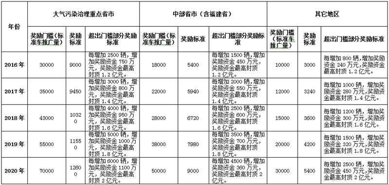 對中部省(包括安徽、江西、河南、湖北、湖南)和福建省,2016-2020年新能源汽車(標(biāo)準(zhǔn)車)推廣數(shù)量分別不低于1.8萬輛、2.2萬輛、2.8萬輛、3.8萬輛、5.0萬輛,且推廣的新能源汽車數(shù)量占本地區(qū)新增及更新的汽車總量比例不低于1.5%、2%、3%、4%、5%。對其他省(區(qū)、市)2016-2020年新能源汽車(標(biāo)準(zhǔn)車)推廣數(shù)量分別不低于1.0萬輛、1.2萬輛、1.5萬輛、2.0萬輛、3.0萬輛,且推廣的新能源汽車數(shù)量占本地區(qū)新增及更新的汽車總量比例不低于1%、1.5%、2%、2.5%、3%。