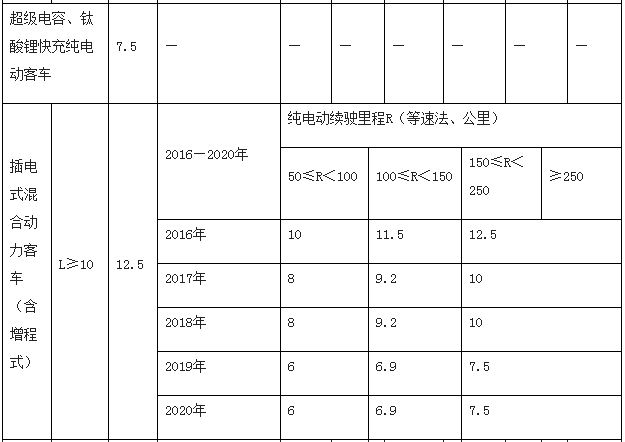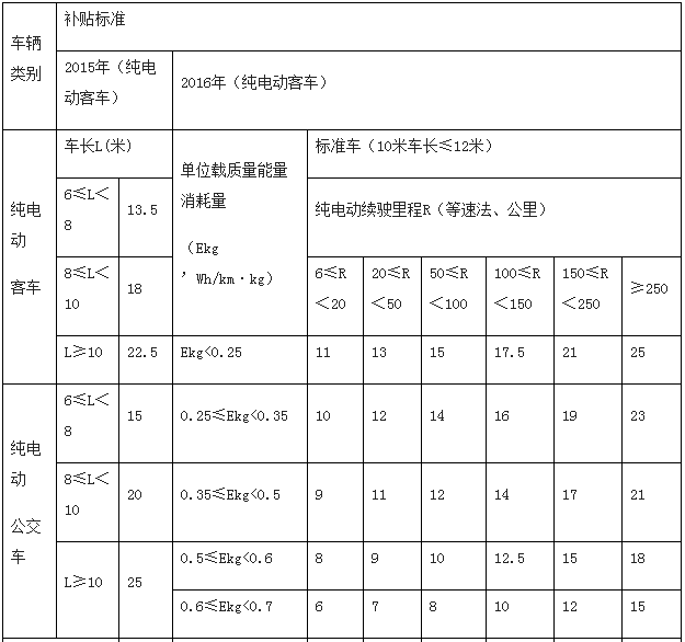 注:純電動(dòng)客車(chē)(純電動(dòng)公交車(chē))補(bǔ)貼標(biāo)準(zhǔn)以2016年為基準(zhǔn),2017-2018年補(bǔ)助標(biāo)準(zhǔn)在2016年基礎(chǔ)上下降20%,2019-2020年補(bǔ)助標(biāo)準(zhǔn)在2016年基礎(chǔ)上下降40%,補(bǔ)貼長(zhǎng)度以10—12米純電動(dòng)客車(chē)為標(biāo)準(zhǔn)車(chē),其他長(zhǎng)度純電動(dòng)客車(chē)補(bǔ)貼標(biāo)準(zhǔn)按照上表單位載質(zhì)量能量消耗量和純動(dòng)車(chē)?yán)m(xù)駛里程劃分,插電式混合動(dòng)力客車(chē)(含增程式)補(bǔ)貼標(biāo)準(zhǔn)按照上表純動(dòng)車(chē)?yán)m(xù)駛里程劃分,其中, 6米及以下客車(chē)按照標(biāo)準(zhǔn)車(chē)0.2倍給予補(bǔ)助;6米<車(chē)長(zhǎng)≤8米客車(chē)按照標(biāo)準(zhǔn)車(chē)0.5倍給予補(bǔ)助;8米<車(chē)長(zhǎng)≤10米客車(chē)按照標(biāo)準(zhǔn)車(chē)0.8倍給予補(bǔ)助;12米以上、雙層客車(chē)按照標(biāo)準(zhǔn)車(chē)1.2倍給予補(bǔ)助。