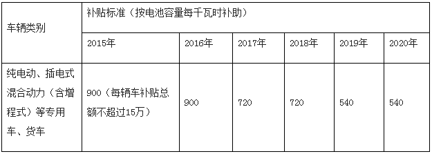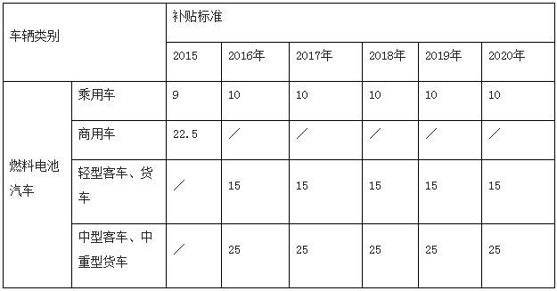 2016年純電動(dòng)、插電式混合動(dòng)力(含增程式)等專(zhuān)用車(chē)、貨車(chē)按電池容量每千瓦時(shí)補(bǔ)助900元。2016-2020年燃料電池乘用車(chē)補(bǔ)貼10萬(wàn)元,輕型客車(chē)、貨車(chē)補(bǔ)貼15萬(wàn)元,中型客車(chē)、中型重型貨車(chē)補(bǔ)貼25萬(wàn)元。