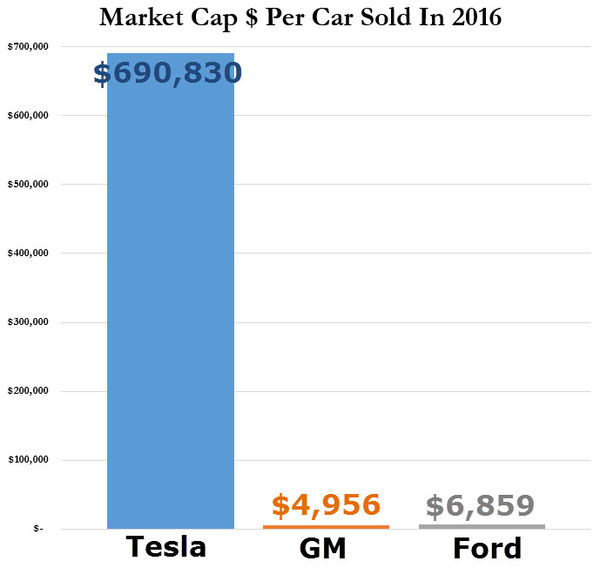 按照當前市值和去年汽車銷量來計算,特斯拉總市值平攤到每輛車上相當于70萬美元,遠超通用和福特。