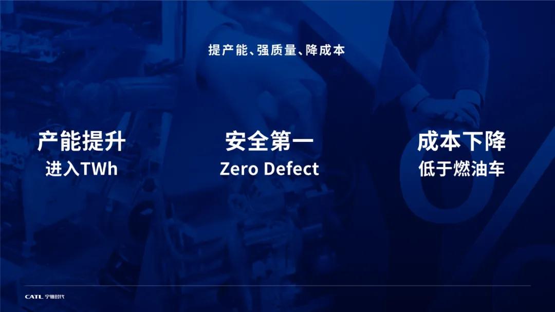 高效、高質的交付是我們供應鏈的核心競爭力之一,上下游必須全力以赴共同迎接挑戰,要提產能,強質量,降成本。首先,產能已進入TWh時代,我們要積極擴產。其次是要提高質量,電池的安全是生命線。我們要安全第一,追求Zero Defect。三是降本,我們要將成本做到低于燃油車的水平。