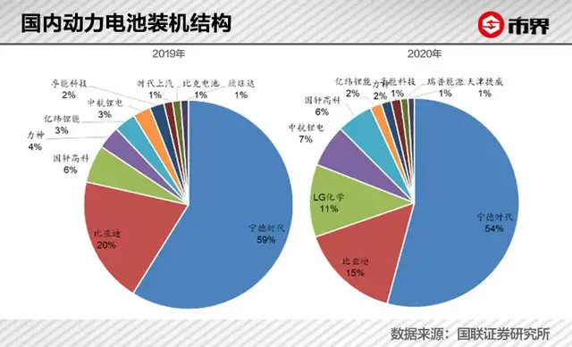 實際上,寧德時代2020年國內市場份額已經略有下降,2019年裝機量占比59%,2020年為54%,下降5個百分點。