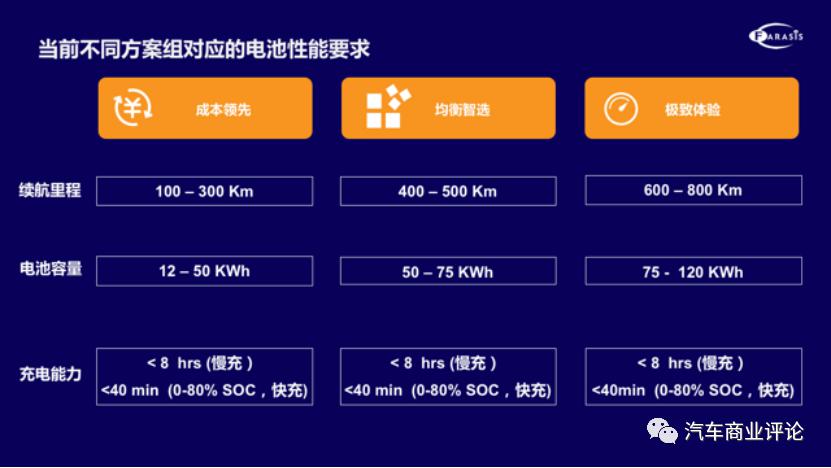 成本領(lǐng)先電池解決方案——滿足目標用戶對低成本購買和使用的需要;均衡智選電池解決方案——滿足目標用戶對產(chǎn)品綜合性價比的需要;極致體驗電池解決方案——滿足目標用戶對高效出行與獨特生活形態(tài)的需要。