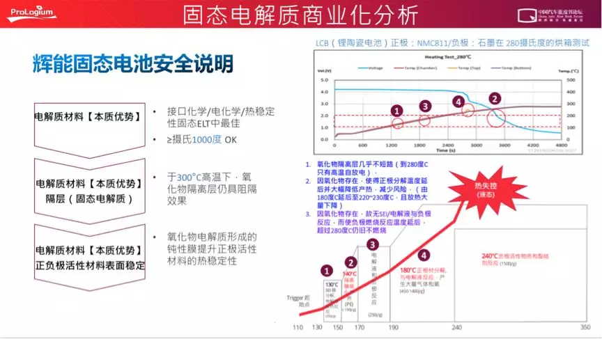 第二個問題,產熱也相對比較小,這使得固態電池在安全性上相對大很多。可能大家對于液態電解質和固態電解質安規檢測不太了解。一般來講,國內現行的標準,烘烤高溫測試狀況是130攝氏度為主,固態電池基本上能通過200攝氏度或者280攝氏度,這個過程安全性上來看,固態電池的確比現在液態電池好很多。