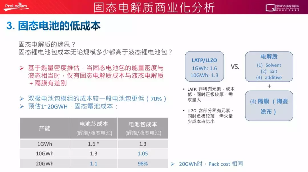 但是第二個問題,在體積能量密度狀況上,他的成組效率是53%,我們成組效率是70%—75%,這個時候我們就超過它了。得出的結論就是說,如果用雙極電池技術的狀況下,我們的能量密度,就算是采用相同的活性材料也能夠達到和現在(液態電池包)一樣的水平,唯一的問題點就是只有固態電解質本身的價格。