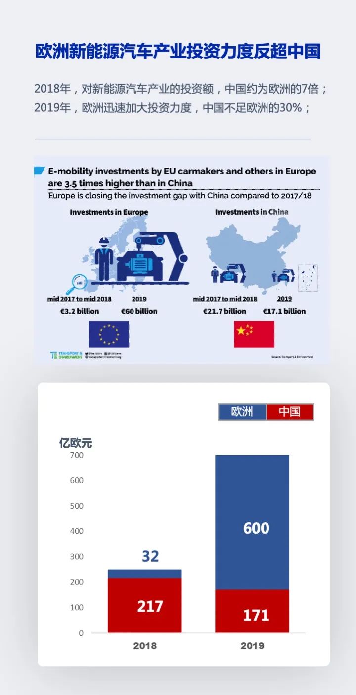第三個反超是投資力度上的,2018年,對新能源汽車產(chǎn)業(yè)的投資額,中國約為歐洲的7倍,2019年,歐洲迅速加大投資力度,中國不足歐洲的30%。如果未來幾年仍然是這個趨勢,沒有投入就沒有產(chǎn)出,我們就很難繼續(xù)待在第一梯隊。
