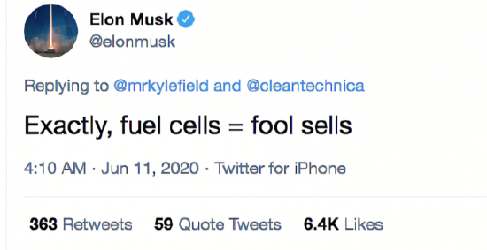 其實馬斯克對氫的排斥由來已久,2020年6月,他曾在社交媒體上公開表示:燃料電池=愚蠢的銷售”,同年7月又補充說:氫電池愚蠢的銷售毫無意義。”