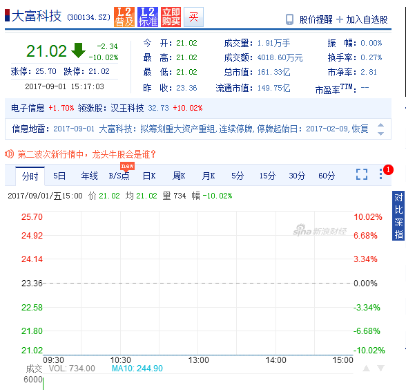 大富科技股價9月1日遭一字跌停,股價大幅下跌10.02%,創一年以來新低。截至發稿,該股封跌停板,報21.02元,成交量2061手。