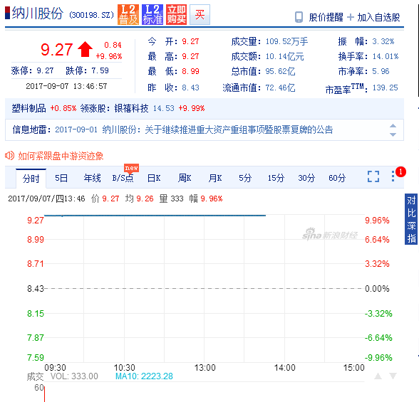 9月7日,納川股份再度漲停。這已經是連續都五個漲停了。