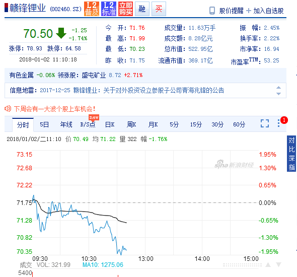 截至2017年前三季度,贛鋒鋰業(yè)業(yè)績保持高增長態(tài)勢,營業(yè)收入28.42億元,同比增長40.51%,歸屬于上市公司股東的凈利潤10.04億元,同比增長106.57%。受益于新能源投資主題反復(fù)活躍的市況,贛鋒鋰業(yè)實(shí)現(xiàn)業(yè)績與股價(jià)雙飛。