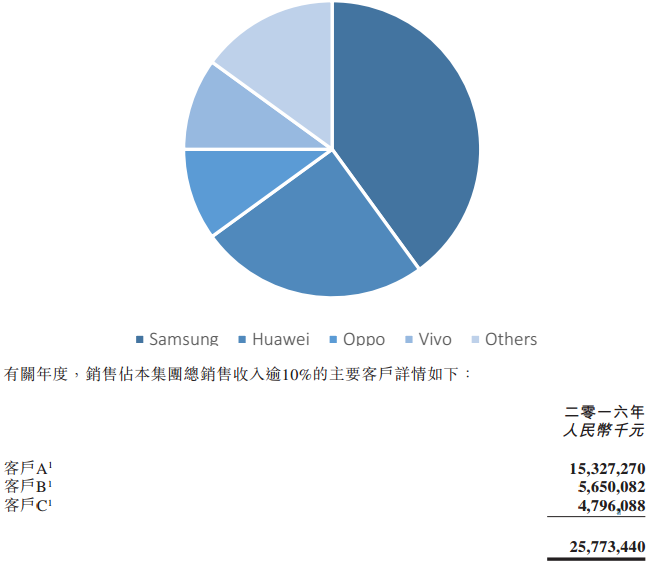 比亞迪電子旗下主要客戶包括三星、華為、OPPO、Vivo等主流智能手機廠家,其中來自三星、華為的收入占比最大,而來自后起之秀Oppo、Vivo的收入也在不斷擴大。三大客戶的收入占比約70%。
