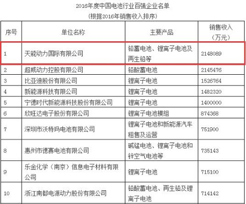 憑借這一數(shù)據(jù),在最新的《2016年度中國(guó)電池行業(yè)百?gòu)?qiáng)企業(yè)名單》中,天能動(dòng)力一舉擊敗所有對(duì)手,成為名副其實(shí)的第一,進(jìn)一步鞏固了龍頭地位。