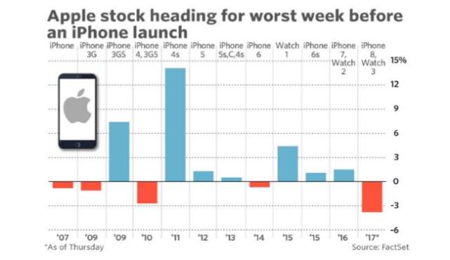 蘋果股價上周下跌5% 有人說是因為iPhone 8遇冷2017-09-25 15:31