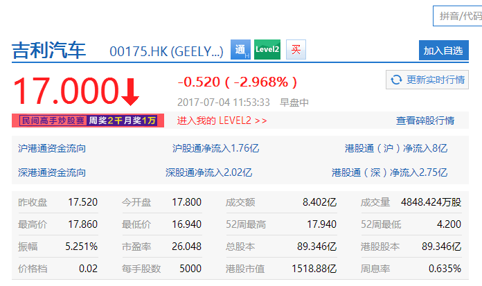 吉利汽車:市值達(dá)到1364.94億元首超廣汽集團(tuán) 位居汽車整車第二