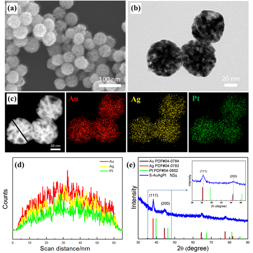 圖1. (a)-(b) 分別為AuAgPt三元合金納米球的場發射掃描電子顯微鏡和透射電鏡圖;(c) AuAgPt三元合金納米球的高角環形暗場-掃描投射圖片和元素分布圖;(d)線掃元素分布圖;(e)AuAgPt三元合金納米球的X射線衍射圖譜。