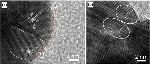 圖2. AuAgPt三元合金納米球的HRTEM圖。(a) 顆粒中存在的孿晶界和高指數晶面;(b) 晶格畸變的局部放大圖。