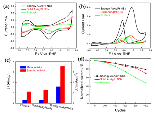 圖3. AuAgPt三元合金納米球、實心AuAgPt合金納米球和鉑黑甲醇電催化性能測試。(a) 在氮氣飽和的0.1 M HClO4 溶液中測試得到的循環伏安圖;(b) 在0.1 M HClO4 + 0.2 M甲醇溶液中測試得到的甲醇氧化曲線;(c) 不同催化劑的甲醇氧化活性對比柱狀圖;(d) 穩定性測試對比圖。