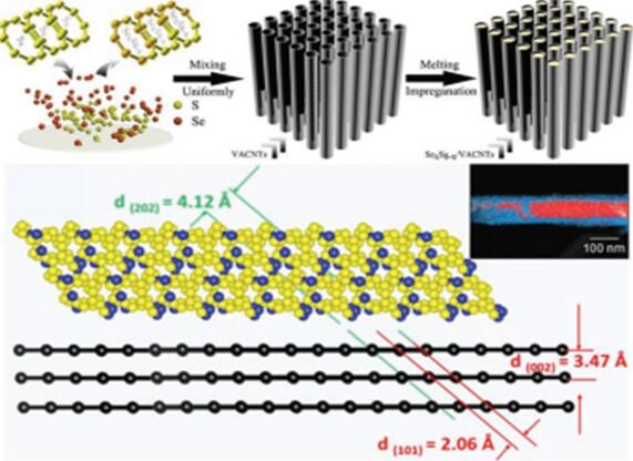 在這次合成中,陳小華教授課題組和駱文彬通過(guò)熔融浸漬法將 SexSy 負(fù)載到碳納米管陣列中,形成同軸陣列結(jié)構(gòu)。該結(jié)構(gòu)將把高度有序的定向碳納米管的高導(dǎo)電性以及對(duì)多硫硒化物的物理限制作用與對(duì)多硫硒化物的化學(xué)限制作用相結(jié)合,具有突出的綜合優(yōu)勢(shì):(1)高度石墨化的碳納米管陣列及有序的介孔結(jié)構(gòu)形成了順暢的電解液、電子傳輸通道。(2)利用了雙重限域作用,活性物質(zhì)負(fù)載于碳納米管內(nèi)腔、管壁的分級(jí)孔及定向碳納米管間隙中,物理的限域作用可以有效抑制活性物質(zhì)的體積變化和溶出,使電極材料保持整體的結(jié)構(gòu)穩(wěn)定性;(3)碳納米管中的雜原子可以與硫、硒之間形成鍵合作用,提高活性物質(zhì)在碳基表面的吸附,協(xié)同抑制了多硫硒化物的穿梭效應(yīng)。(4)S8分子中引入Se原子進(jìn)一步增強(qiáng)其浸潤(rùn)性,不但抑制多硫硒化合物的溶解,而且增強(qiáng)微孔的毛細(xì)吸附作用,進(jìn)一步提高活性物質(zhì)的裝載量。該同軸結(jié)構(gòu)作為鋰硫電池正極材料不但顯示出大容量的長(zhǎng)循環(huán)穩(wěn)定性,而且具有杰出的大電流性能,能夠滿足未來(lái)儲(chǔ)能器件高功率、大能量密度需求。該同軸結(jié)構(gòu)在0.1A /g的電流密度下,容量達(dá)到1404.5 mAh/ g,能量密度高達(dá)1800 Wh /kg,且具有93%的高庫(kù)倫效率。 即使在7 A /g的大電流下,容量仍達(dá)到 613 mAh /g, 顯示了突出的大電流性能。這種具有高度有序電子、離子通道,以及物理和化學(xué)雙重限制的多硫化物穿梭的策略,為獲得高性能鋰硫電池提供了一種新的解決途徑。