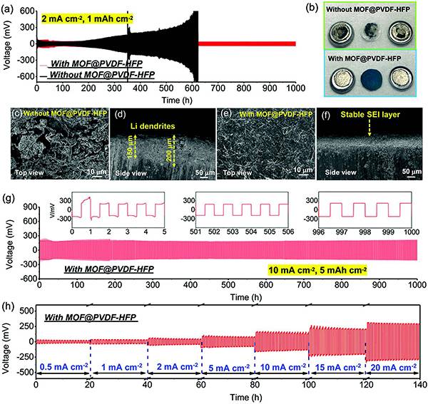 (g)具有MOF @ PVDF-HFP隔膜的Li // Li對稱電池在10mA cm-2的高電流密度下的循環穩定性,在1000h內的面積容量為5mA h cm-2。